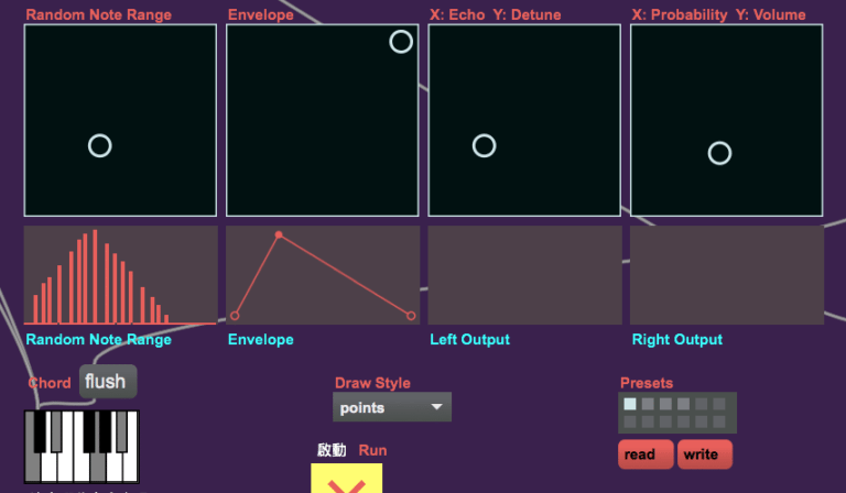 這件自動生成音樂的小合成器,可供選擇的參數包含隨機演奏的音域範圍、Envelope、Echo等等,使用者也可以指定喜歡的音符,或直接切換成大七與小七和弦。而你也可以將簡單的樂理機制編寫在M4l Device中!