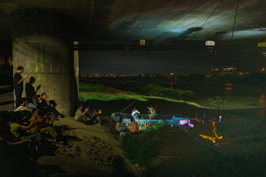 最後我們來到舊港大橋下,由淑媛姐[4]熱情的與我們分享當地居民與河流的互動方式,從過去的水到現在的水,洗衣、採蚵等,藉由光影的運用將曾經的河水生態、小船景貌,經過日夜交替的引導來到了當下,我們隨著潮汐密碼[5]的起伏將我們感受到的河流記憶呈現。