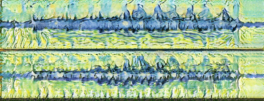 ▲ 使用Runway ML,資料輸入來源為音訊波形圖檔(上方),程式依據此圖檔以及資料庫,自動輸出生成下方的新圖檔。