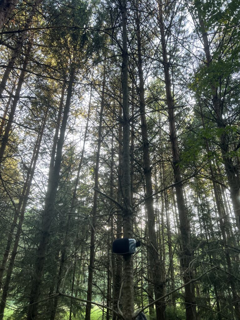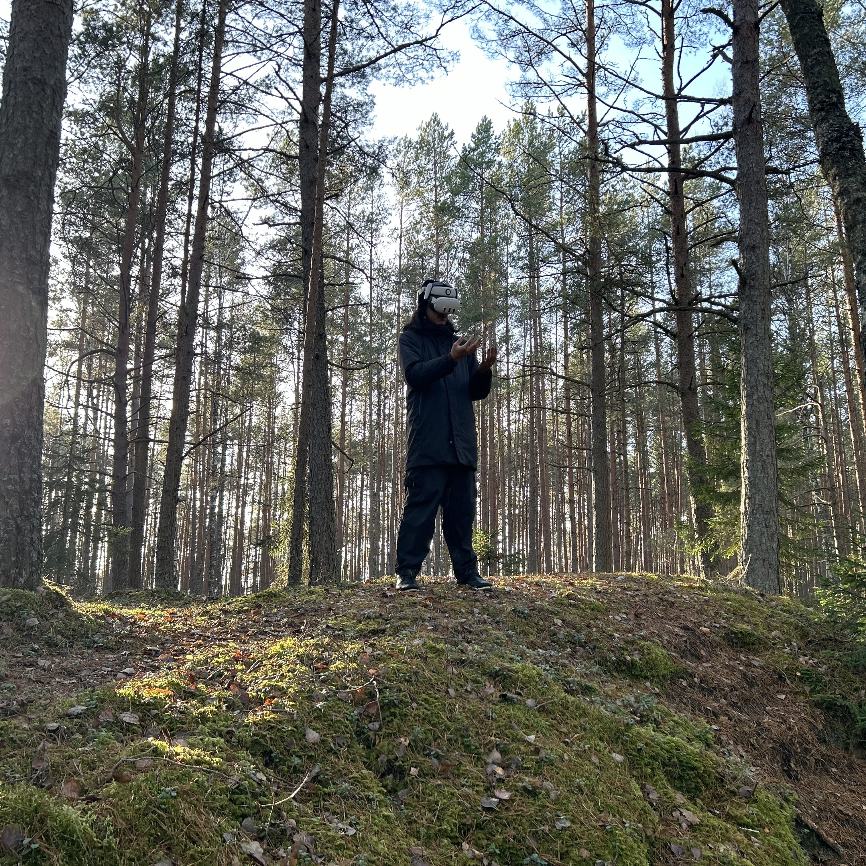 陳瑜璟於 2025 年夏季進駐拉脫維亞 RIXC,展開以「森林的資料化與機器感知」為核心的研究。期間,她多次前往里加近郊的森林進行田野踏查,以 3D 掃描蒐集地形、植被與空間結構的點雲資料,並將其清理、重建與簡化,建立一個可供後續創作使用的森林資料基底,並同步進行環境錄音,採集風聲、昆蟲振動、遠方活動聲響等多層次聲景,作為作品中「不可見訊號」的重要來源。在語言與聲音研究上,她以 Audio Captioning 模型將錄得聲景轉譯為敘事性文本,再與點雲視覺資料共同輸入大型語言模型,生成介於觀察與詩性之間的「森林語彙」。這些技術探索使她能建構未來沉浸式作品的聲音敘事結構與資料操作方法。