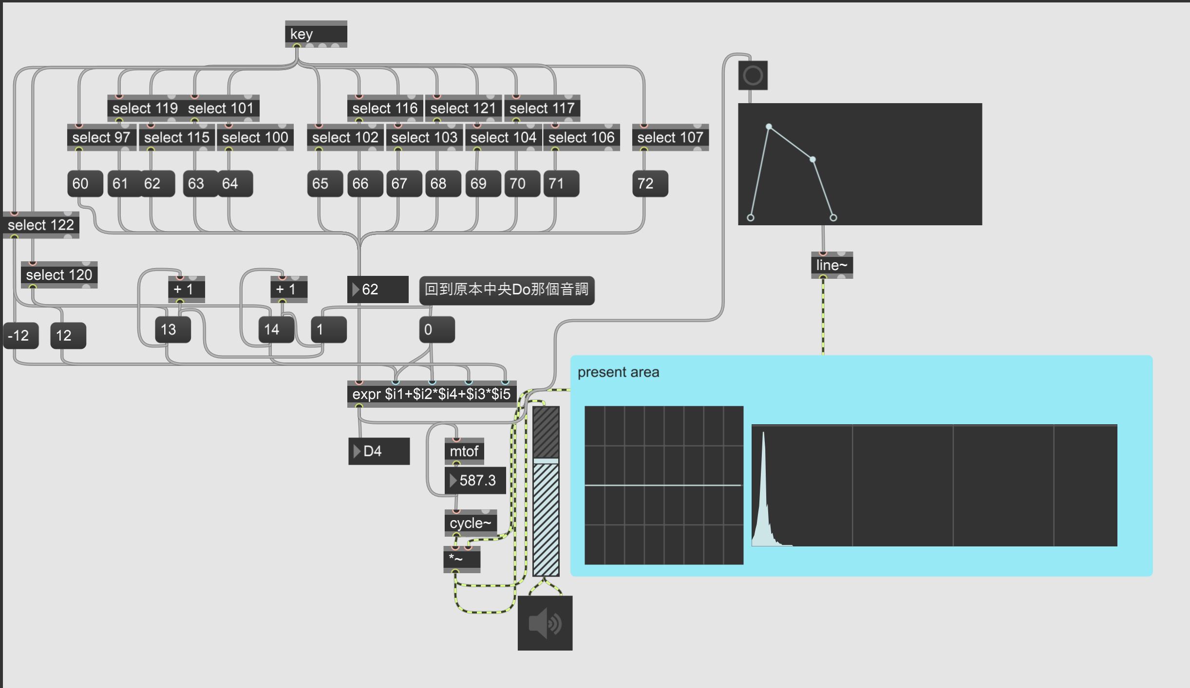 最近由於期中轟炸,拖到最後一天才開始做這次作業。這次作業是要求我們做一個簡單的合成器,當下我唯一想到的就是把 Ableton Live 的可以用鍵盤彈奏的功能用 Max 做出來,花了一點時間在想如何能夠跟 Ableton Live 一樣透過 z 跟 x 鍵讓音低或高 8 度的邏輯,好不容易用老師額外補充的expr才搞定。這次遇到的問題是我照著function help的說明試著要拉出曲線但是都沒有成功,但因未繳交時間快到了就沒有繼續嘗試了。