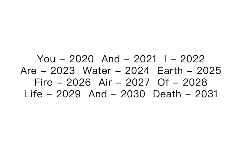 該項目需要 12 年才能完成:每年的主題即是標題的一個單詞,每次演出為12小時,每一小時為一組表演。